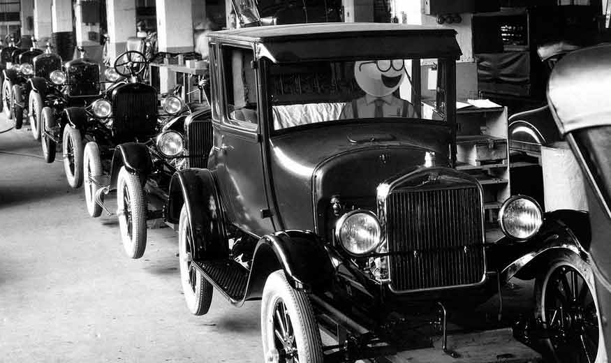 Oscar had a working history with Henry Ford and other early auto pioneers that helped bring the internal combustion engine and the automobile into reality. In 1913 Ford approached Oscar complaining that he did not know how he could compete with others in the industry. Oscar suggested that increasing efficiency would be the only way to lower costs and thus expand the market to dominate the industry. He devised the idea of a production line assembly system and handed Henry a complete factory design. The rest is history. Although Ford never publicly acknowledged his use of Oscar, the production of the limited edition Ford Model O in 1917, is broadly seen as a wink and a nod to Oscar’s contribution.